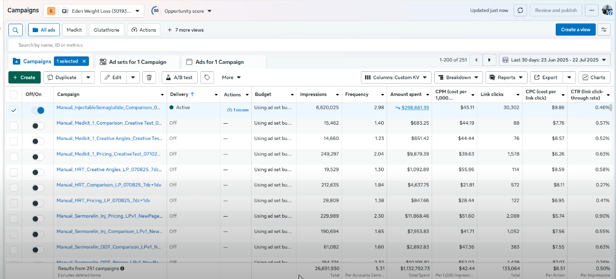 Eden Weight Loss, a medical weight management brand, needed a Meta Ads strategy that could maintain brand compliance while scaling lead generation efficiently. I managed and optimized large-scale campaigns targeting multiple product lines, including Injectable Semaglutide, HRT, and Medkit offers, across North America.